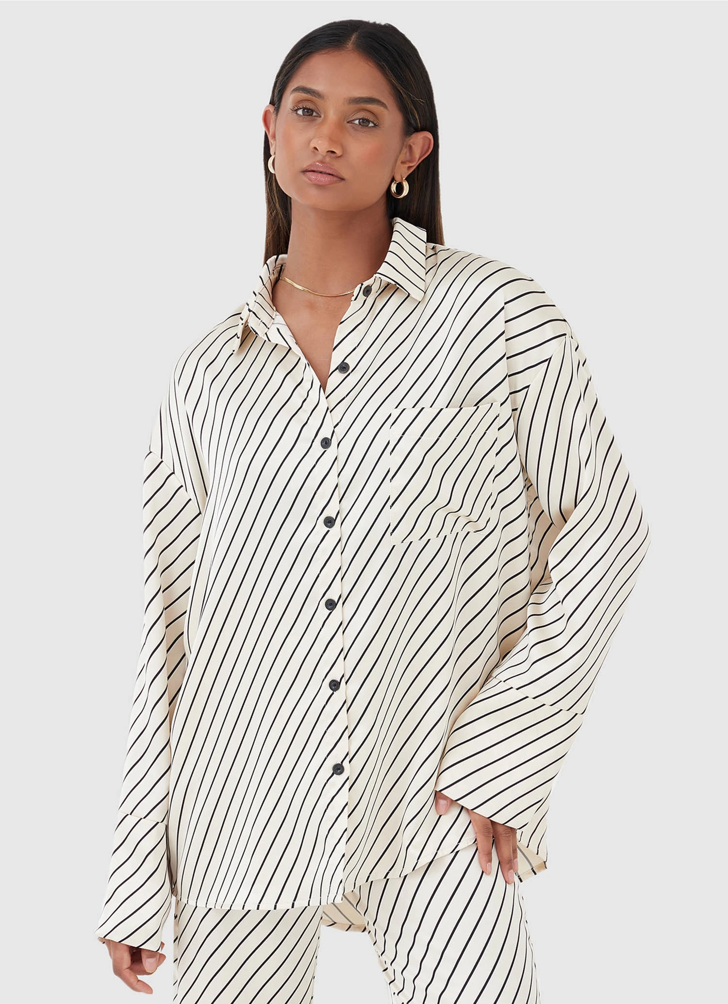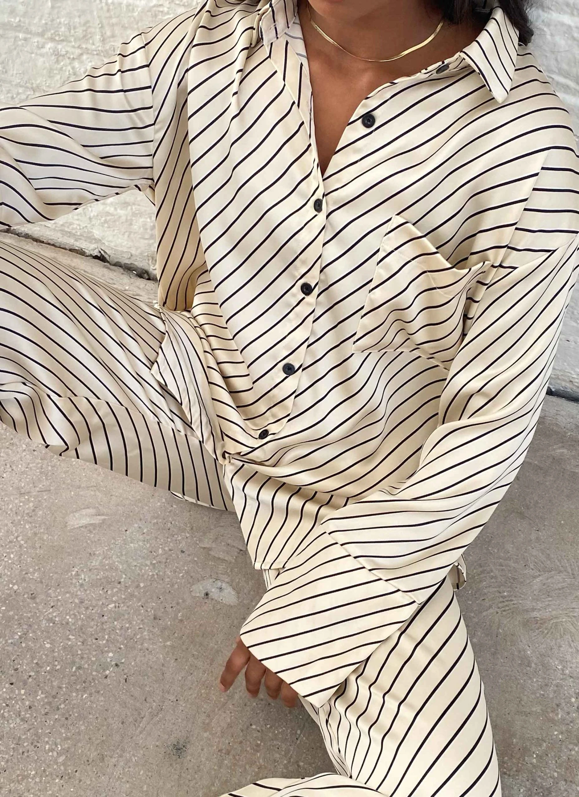 A traditional style striped in a diagonal black and cream. The Norma shirt is crafted from a silky fabric for a classic look. With easy to wear button fastening, you’re bringing relaxed energy to your everyday wardrobe. Simply style with the Norma trousers and sandals.