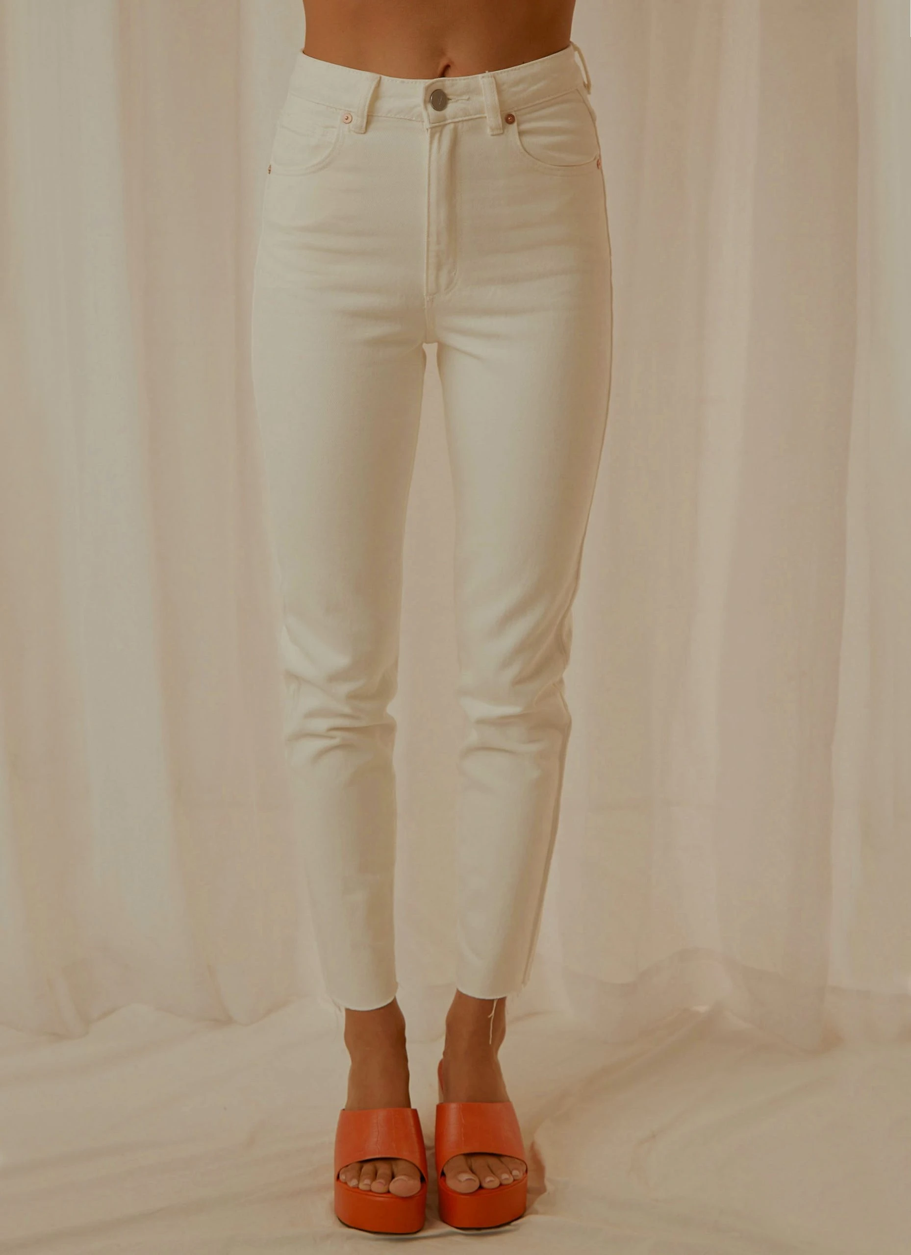 The A 94 High slim in White Fade is a high rise, slim leg jean, made with a rigid denim. We suggest going up a size.