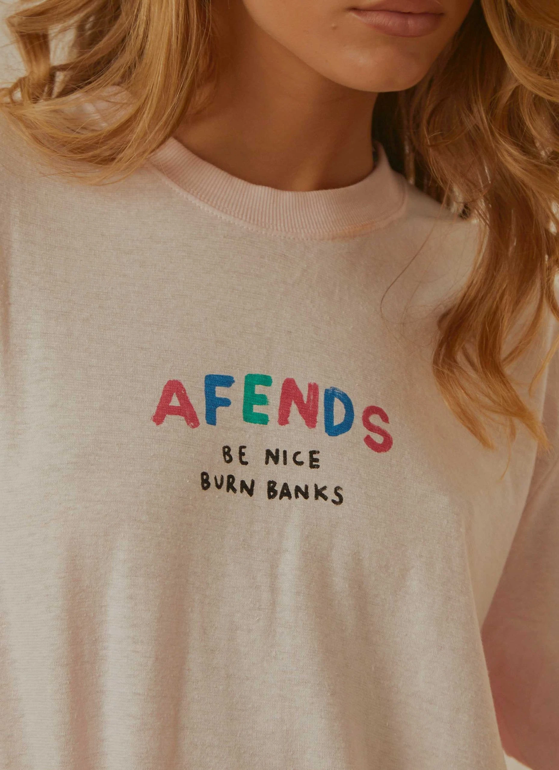 Be nice, burn banks. In collaboration with the creative mastermind Beni, this unisex tee is part of our Be Nice, Burn Backs artist series. Spun from our staple blend of hemp and OCS certified organic cotton jersey – this tee is for you and the planet. Our signature retro fit offers versatility with a relaxed shape and wide ribbed crew neck. Finished with Beni’s vibrant Afends logo, this tee puts the power in your hands.