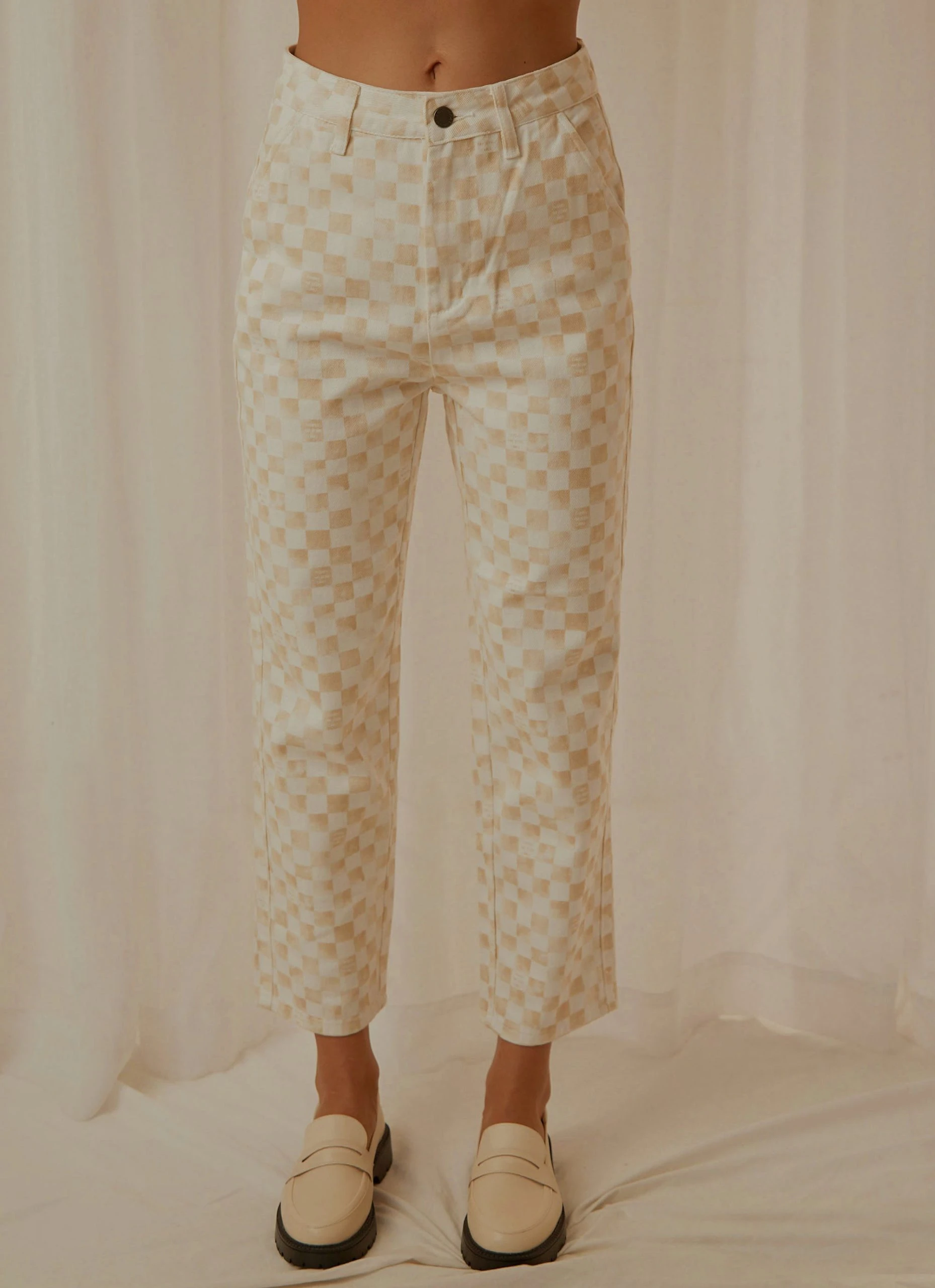 The California Pants in Sand Checker sit high on the hips and have straight legs that are cropped just above the ankles. These stretch-cotton denim pants feature a zip fly closure and a logo-debossed leather patch at the back.
