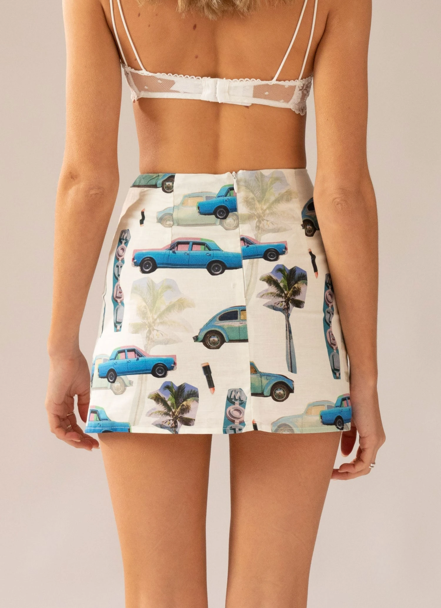 The perfect summer party print! A cute ?lil linen mini skirt crafted in a crisp white linen with a vintage inspired retro print. This is a fitted, mid rise style with invisible zipper closure.