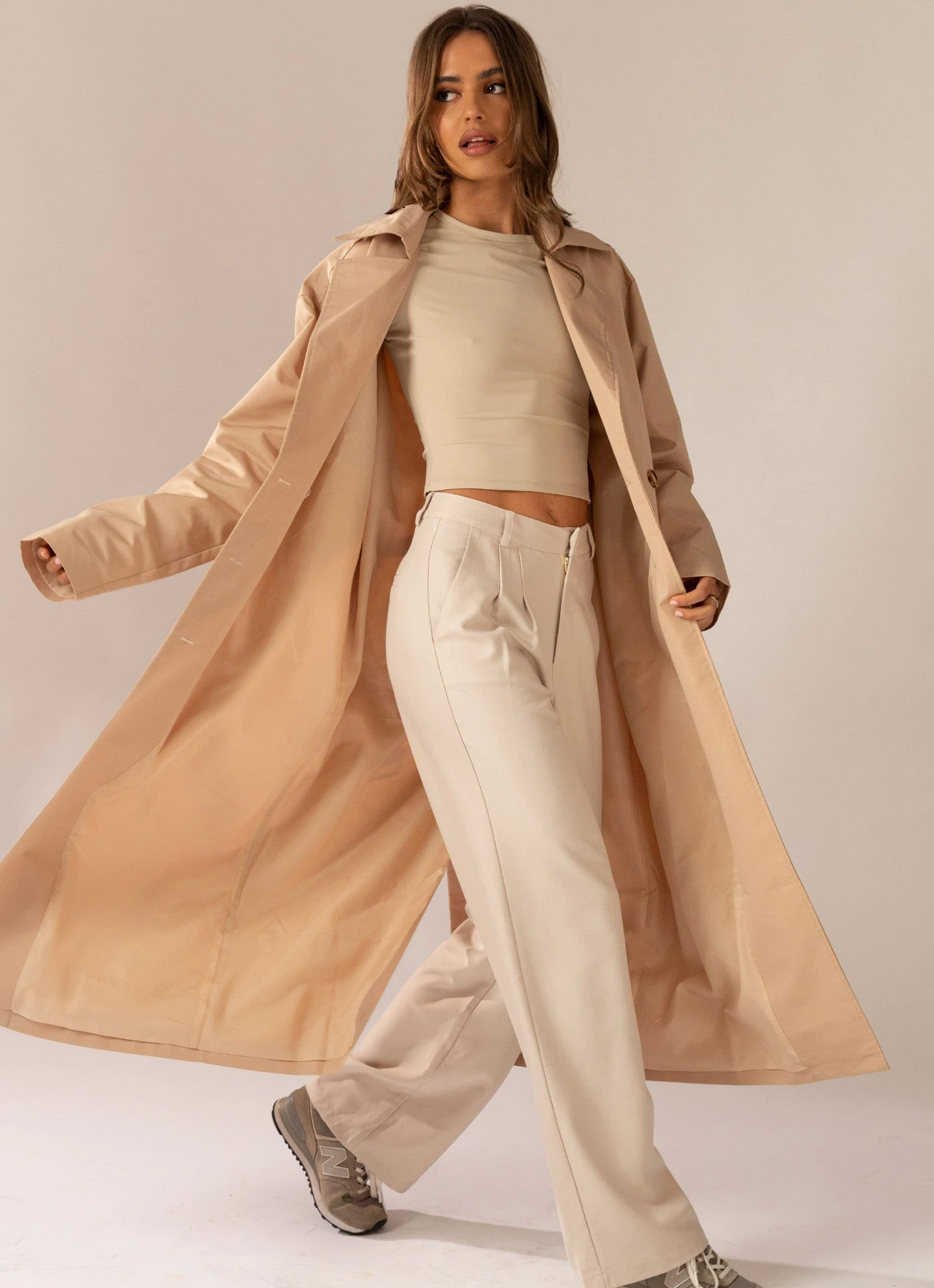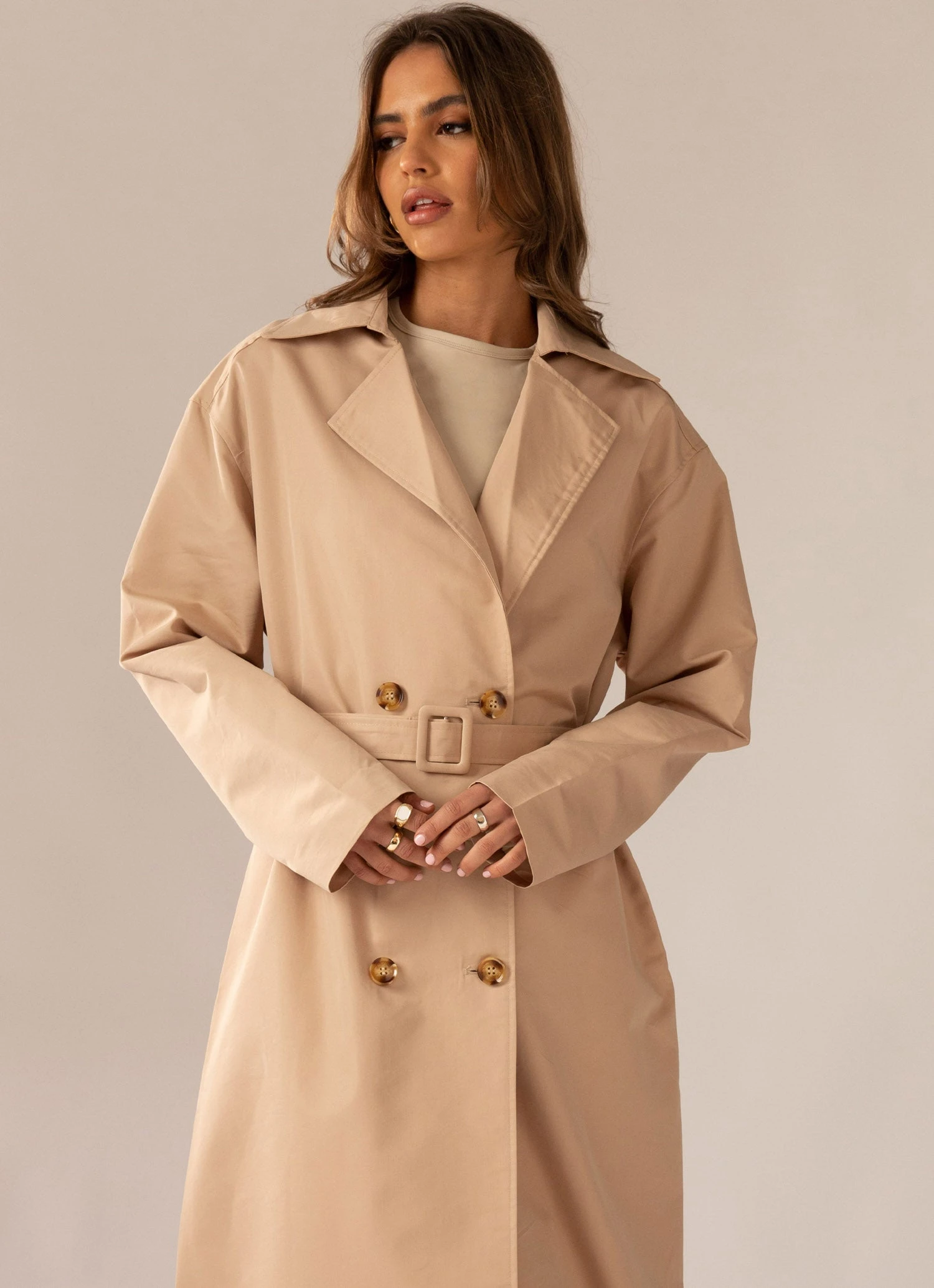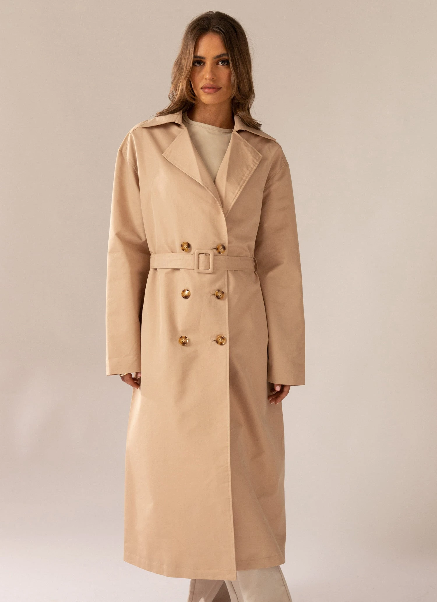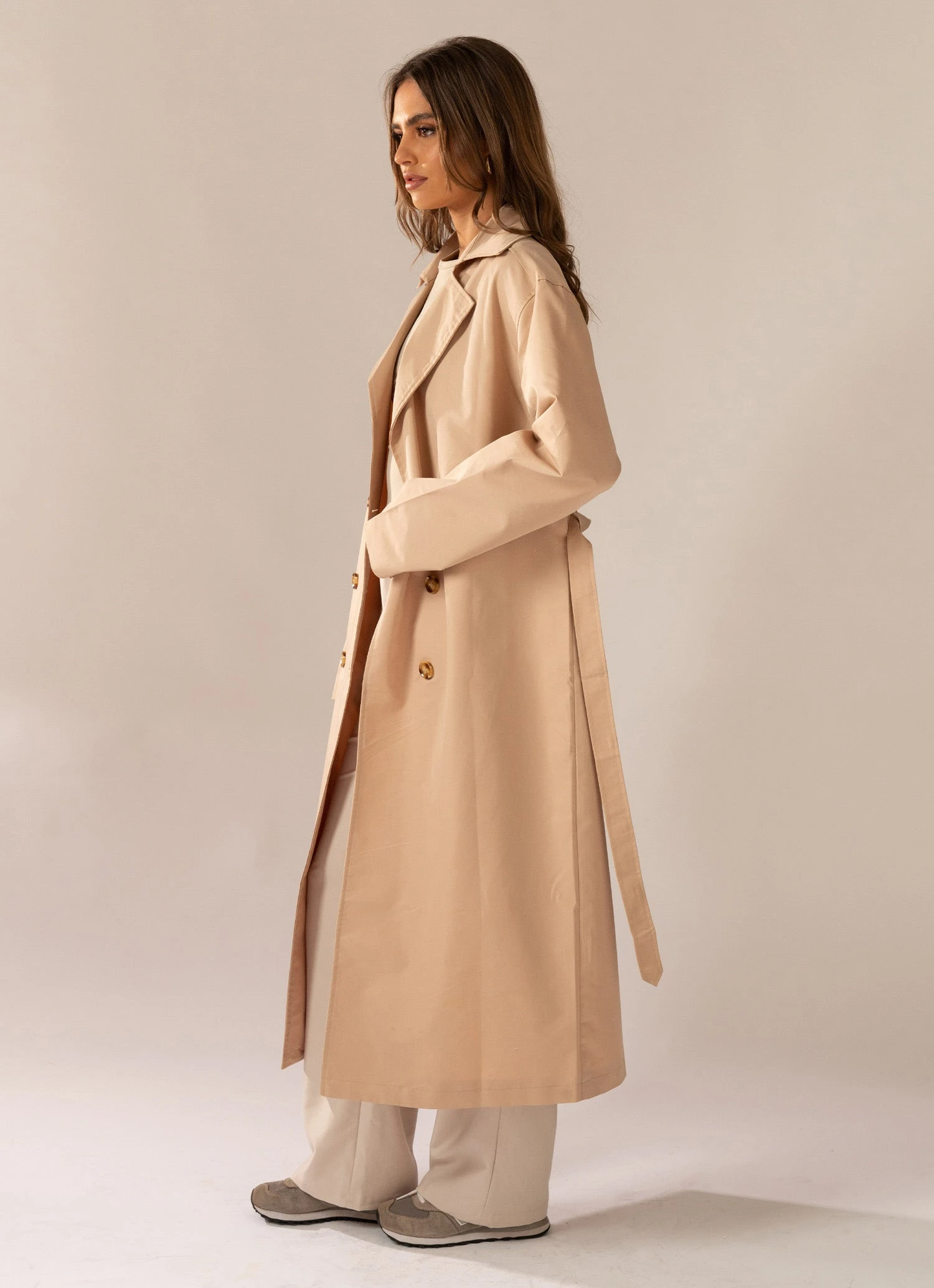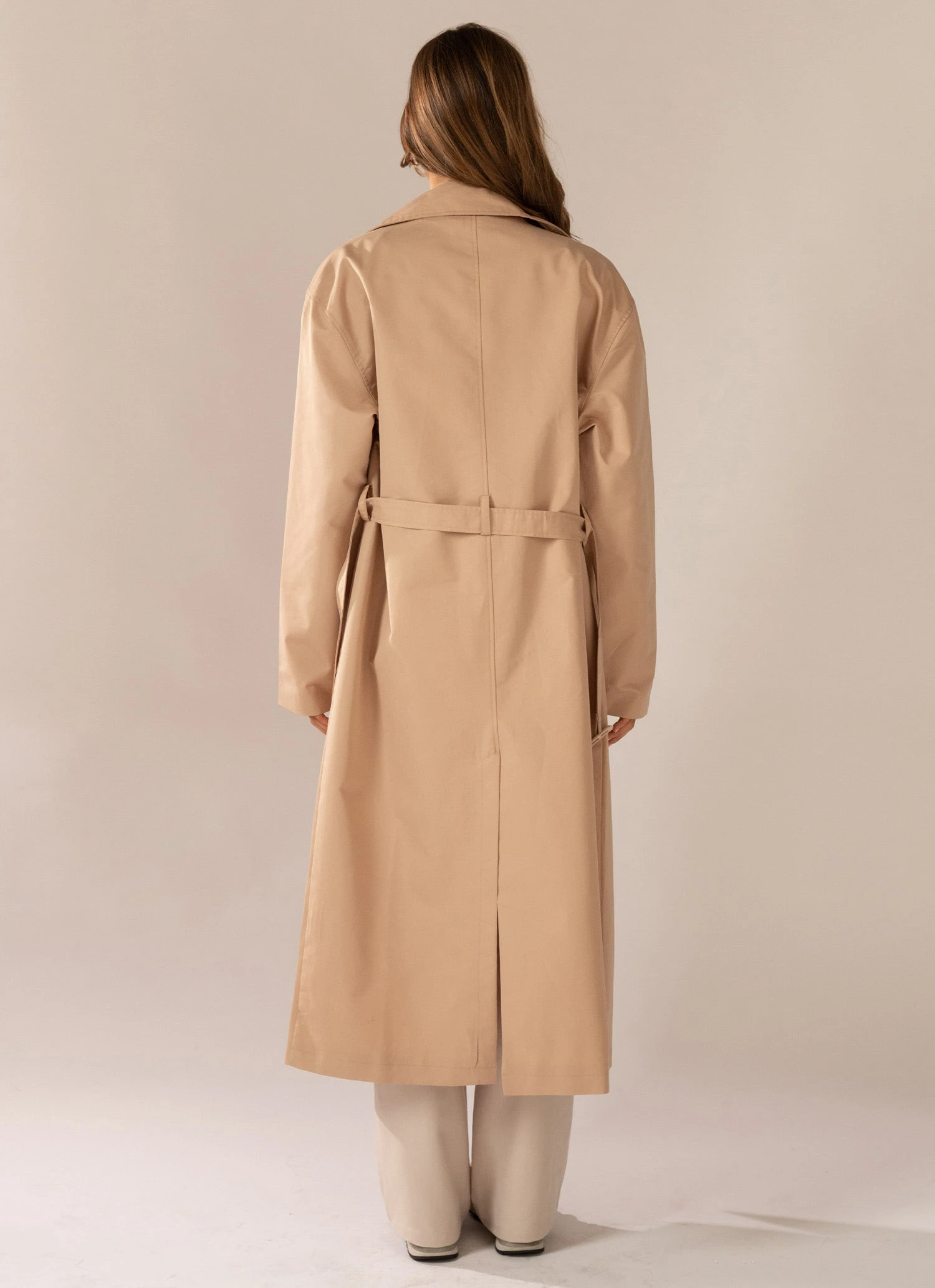 The hottest styling piece this season! Our Hide and Chic Longline Trench Coat is a transeasonal piece crafted in cotton blend and a neutral tan hue. A collared design with 7 botton detailing and adjustable waist belt that elongates the body with it’s longline length.
