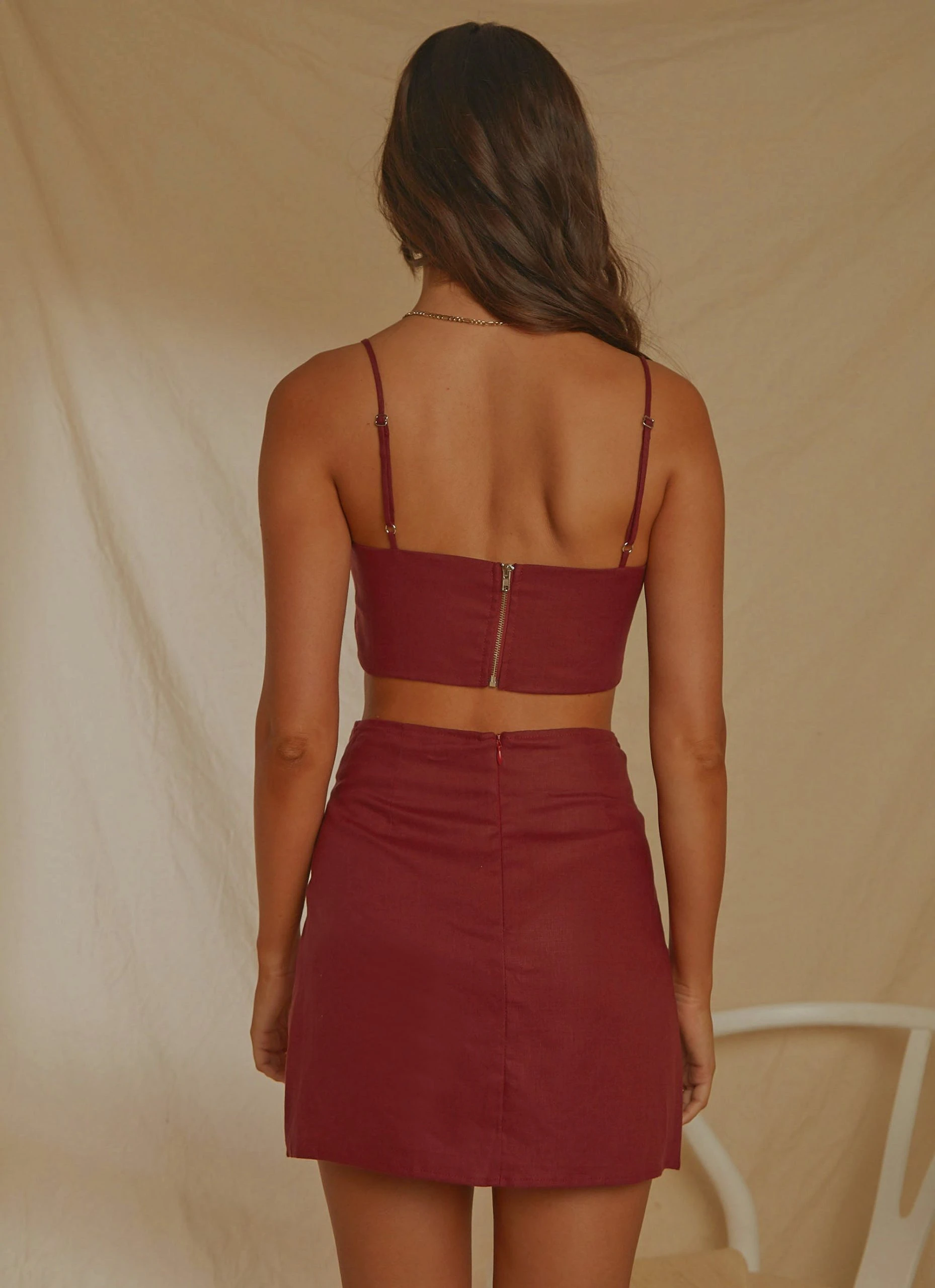 The wardrobe staple every cool girl needs.The Island Nights Crop Top is a linen crop in Burgundy. We love it paired with the European Edition Mini Skirt and gold earrings.