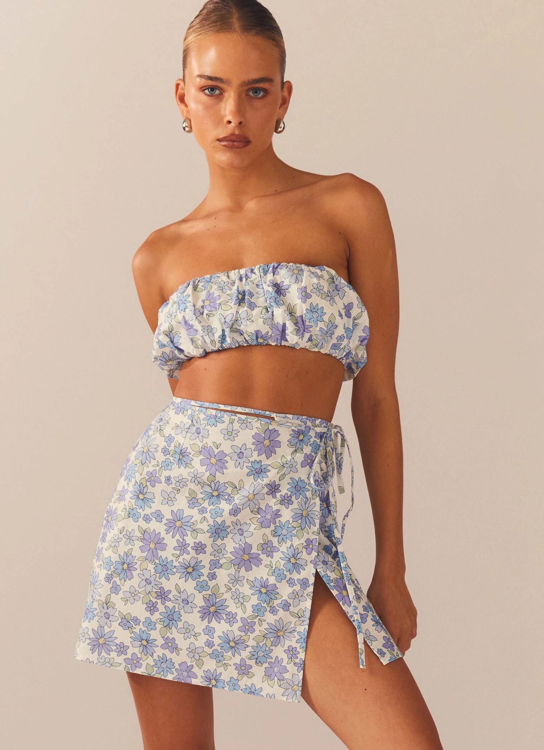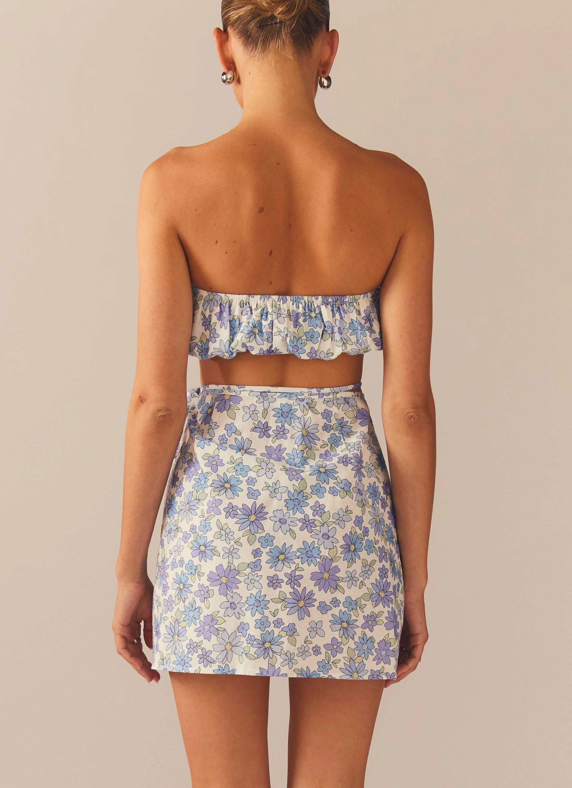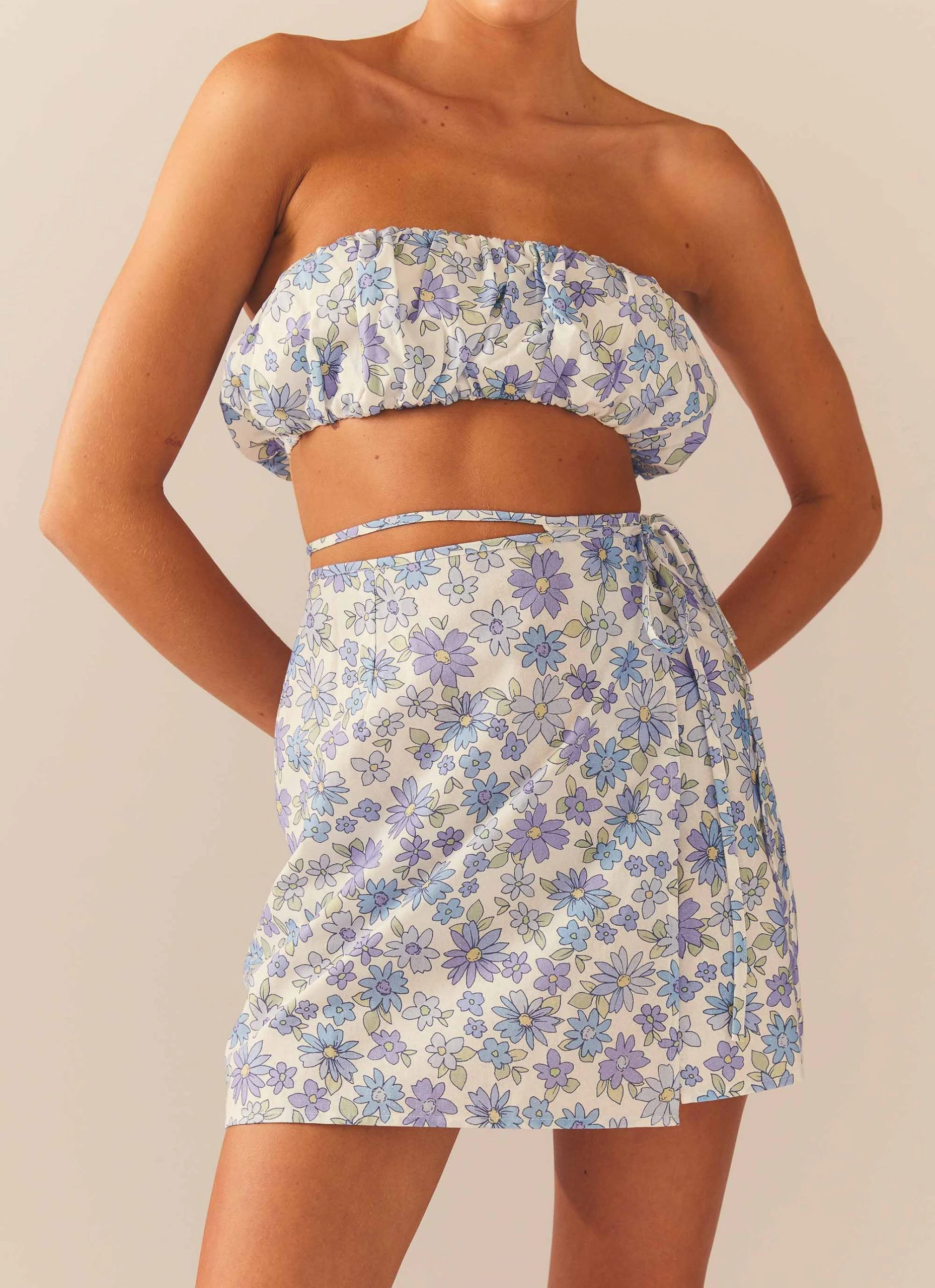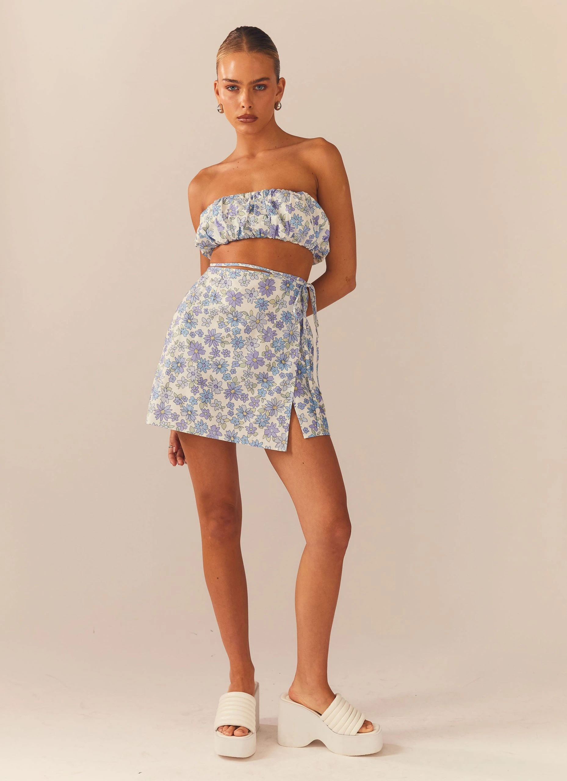 The perfect beach to bar, easy to wear mini skirt now in our exclusive Daisy Chain print. This lil number wraps around the body and ties at the left hip creating a gorg tie up moment.