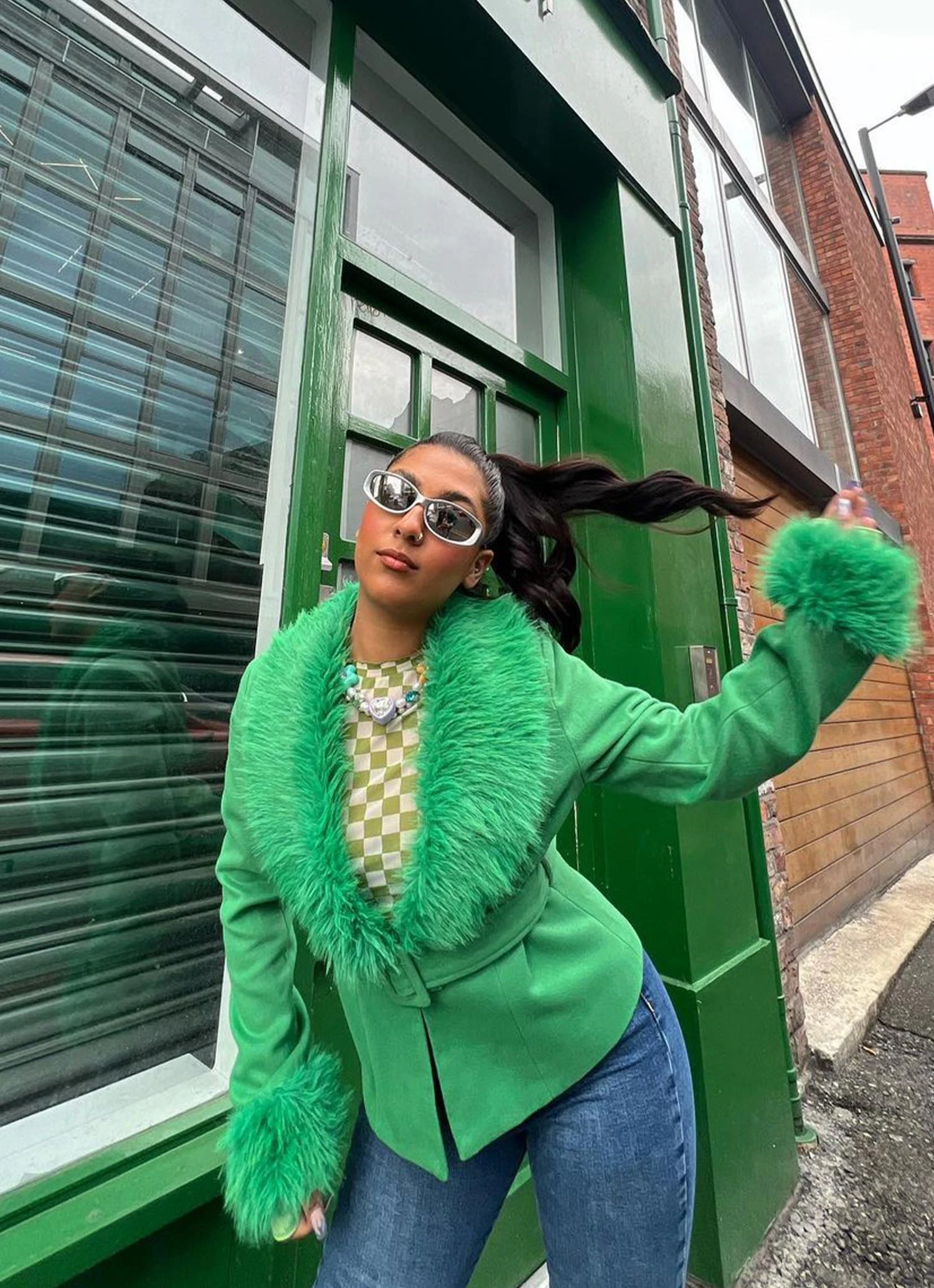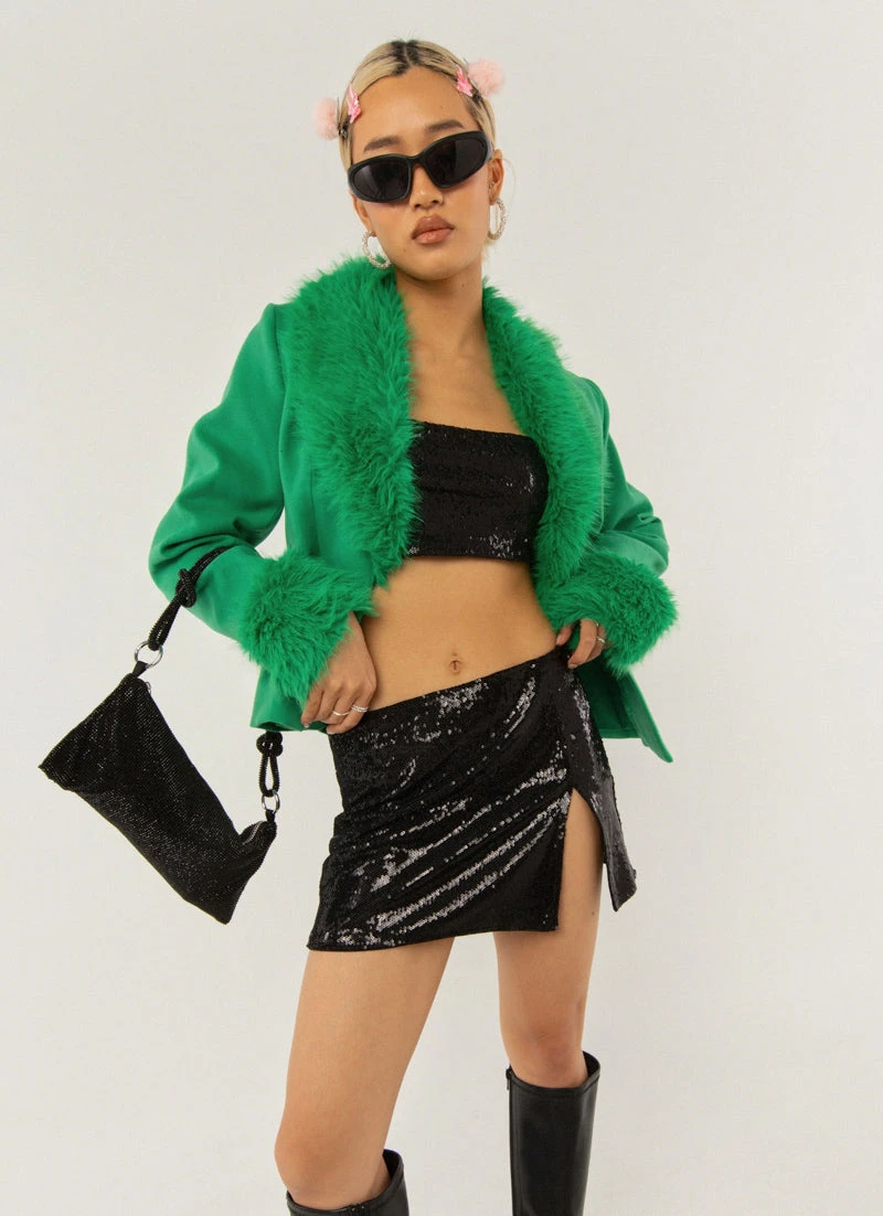 A trip down memory lane with the Maddy Faux Fur Jacket in eye catching Jade Green. A 70’s inspired jacket featuring shaggy lapel, collars and cuffs. Single internal button closure with belt and buckle. Complete the retro look with a cropped white tank high waisted vintage denim.