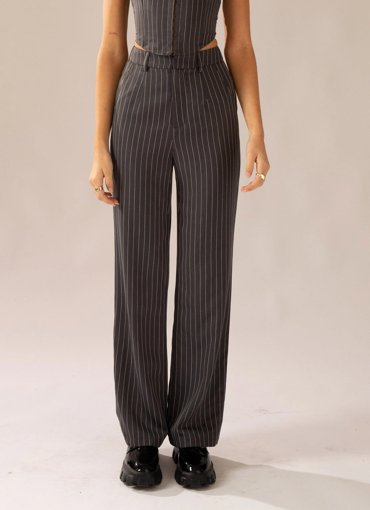 We’ve got the answer to all your pant prayers! Say hello the the Mia Suit Pant. Designed to be worn high on the hips in our soft Charcoal Pinstripe Print featuring 2 pocket detailing at the front and back darts for tailoring. Elevate your look and style it with the Mia Suit Bustier, layered with the Mia Oversized Blazer.