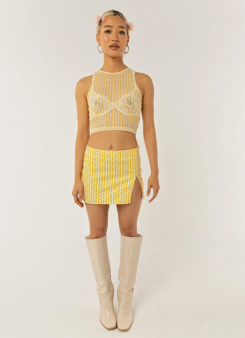 Simple but effective. Our Patience Mesh Crop, made in soft mesh and features our exclusive print in an eye catching yellow. Made for music and sunny days. We love it layered over the Your Only On Bustier Top and paired back with the Higher Power Mini Skirt.