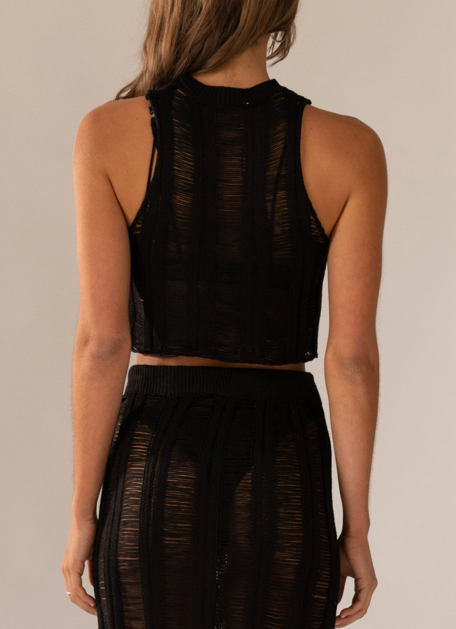 Festival ready! The Perri Ladder Knit Tank ticks all the festival fit boxes with its cute cropped length, crew neck and ladder knit fabrication. Layer it over swimwear and pair it back with the Perri Ladder Knit Skirt and boots.