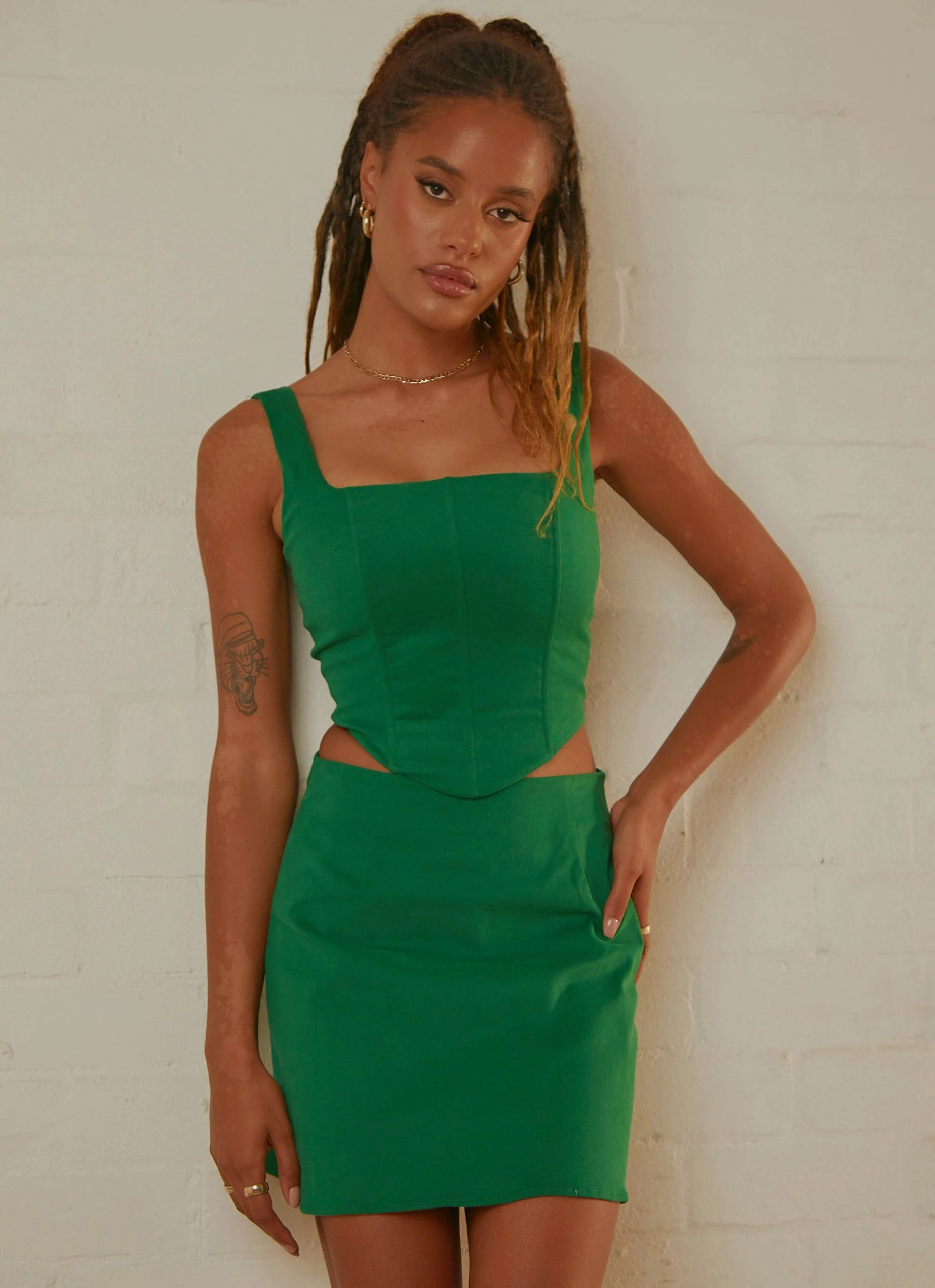 Our Rooftop Drinks Mini Skirt pairs back perfectly with the Pastel Skies Bustier Top, the perfect look for sunset cocktails overlooking the ocean.