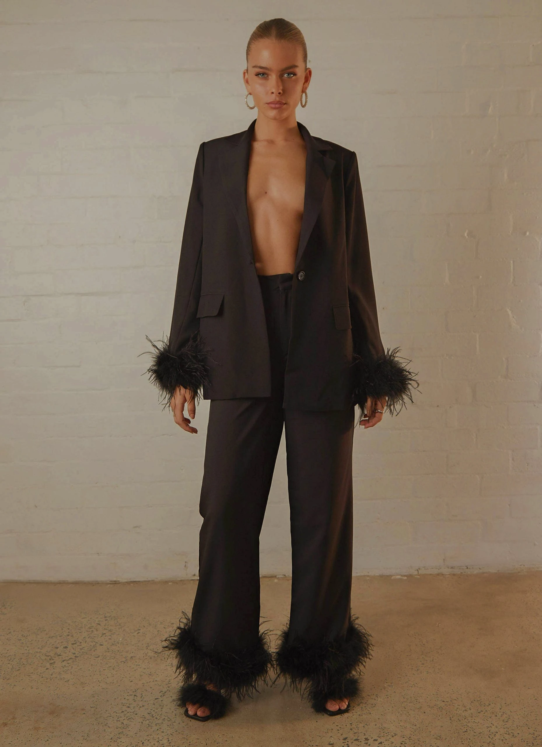 Shake it like a polaroid picture! Be the life of the party in the fun Shake It Off Feather Pants, designed to be worn higher on the hips with a wide leg fit and hemmed with feathers. Made for the Peppermayo party girl! Complete the look with the Shake It Off Feather Blazer, heeled mules and simple jewellery.