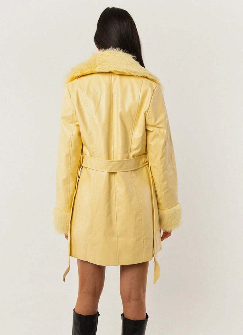 A 90s vision! The Song Of Sunshine PU jacket is what all retro dreams are made of with faux fur cuffs and a removable lapel. The perfect length and button down front, easy to cinch at the waist with the removable self tie belt.