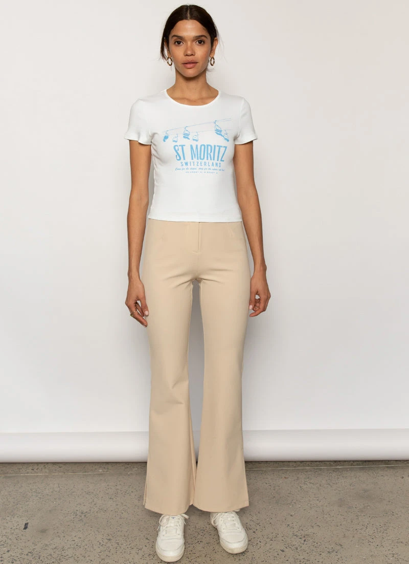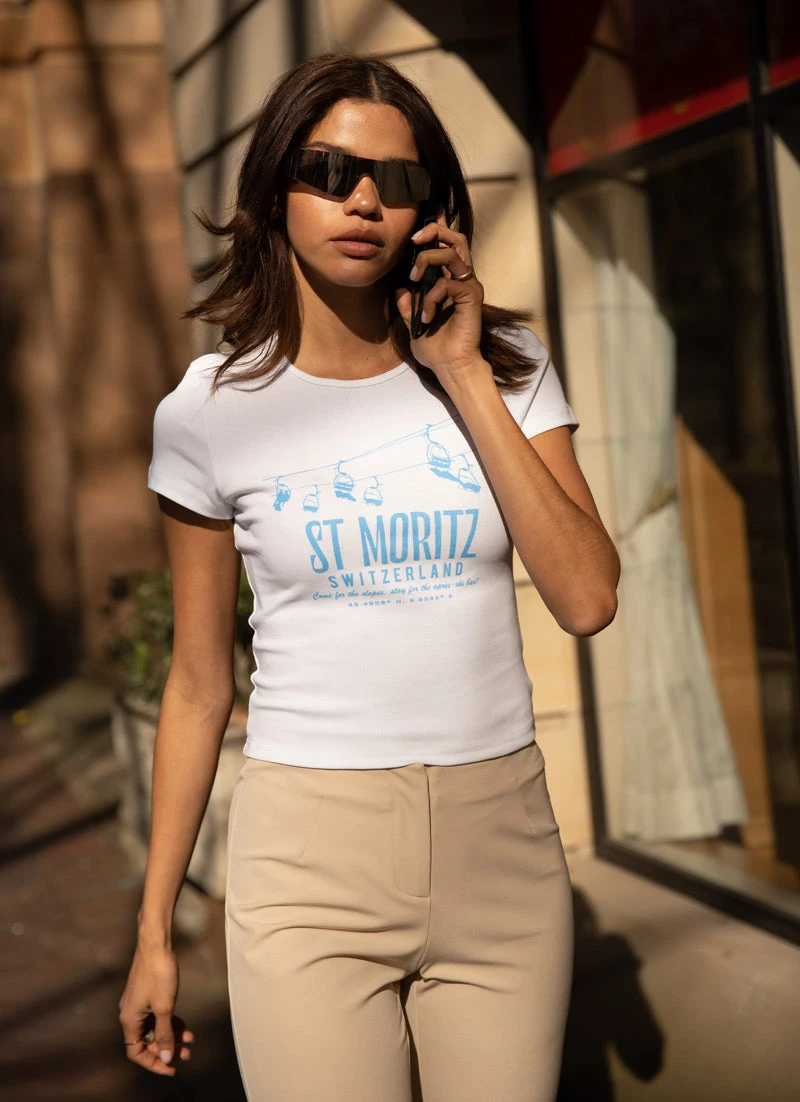 Cute from head to toe is your default setting. The St Mortiz Baby Tee is a classic 90’s style crop top with a round neck that’s slim fitting through the body and features our Peppermayo Exclusive Après Ski graphic on the chest.