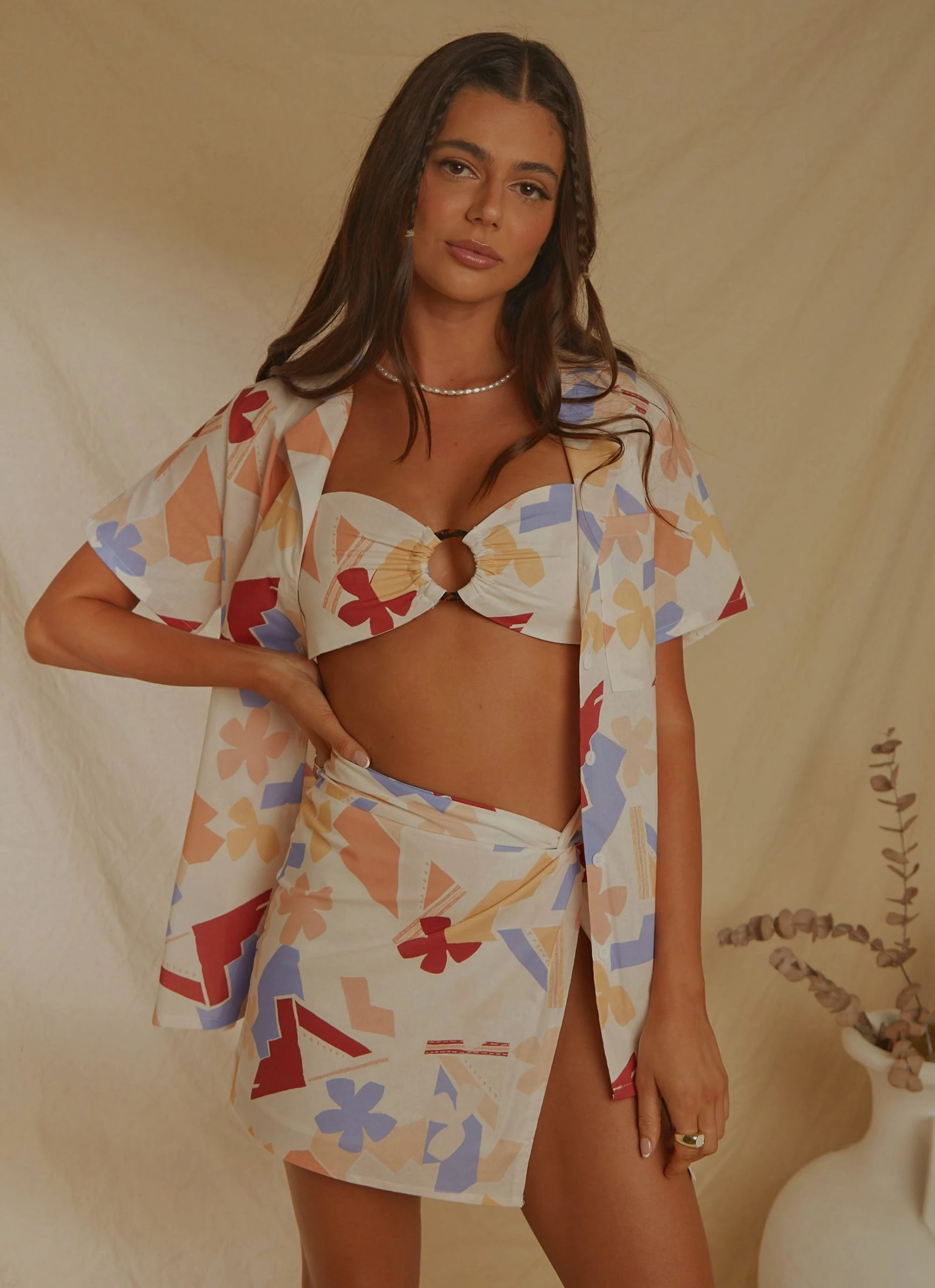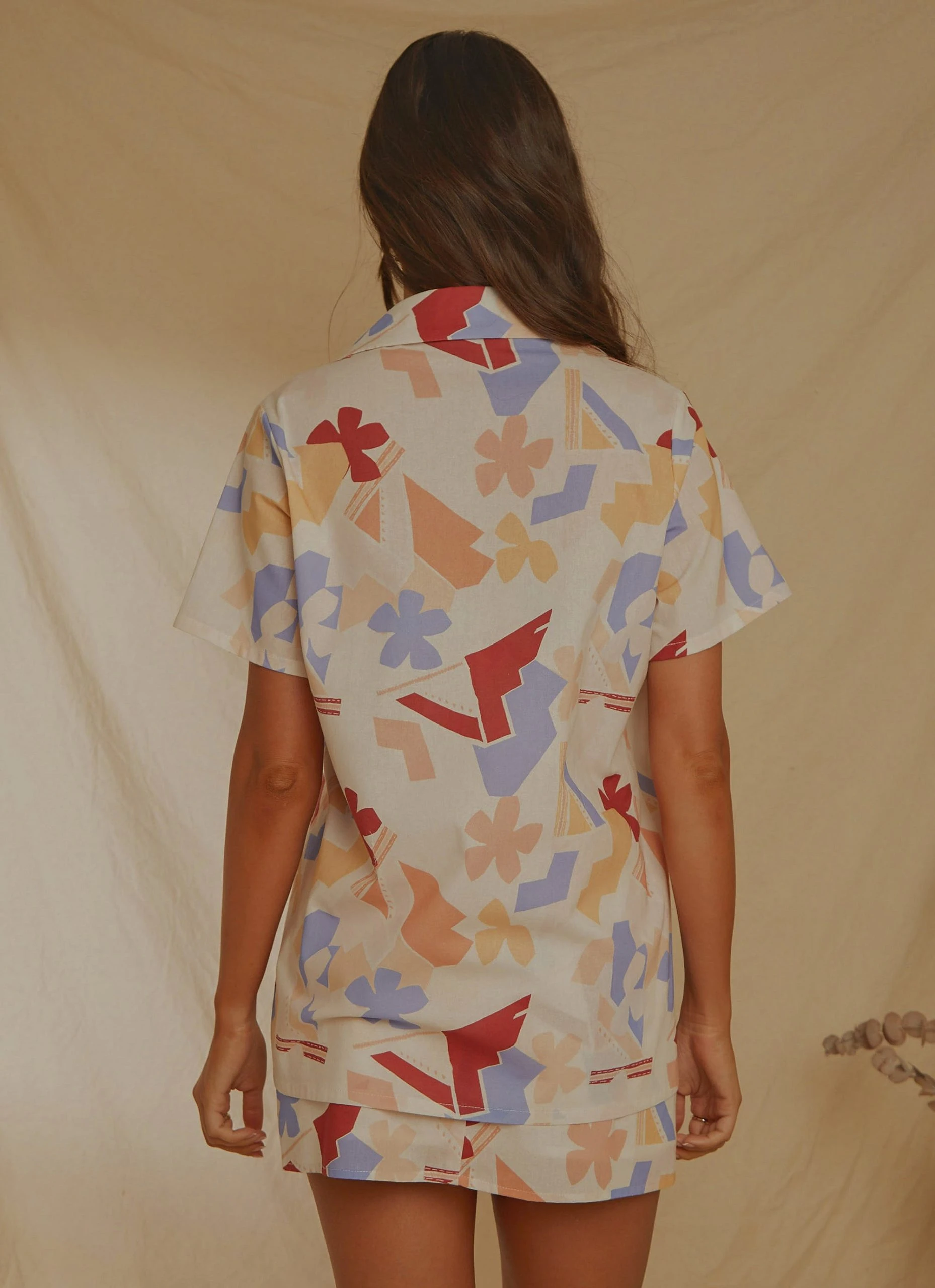 Cool girl vibes all summer long in the Sunset Apertivo Shirt. Featuring an abstract print, this shirt can be styled open with a cute crop or buttoned down with any bottom.