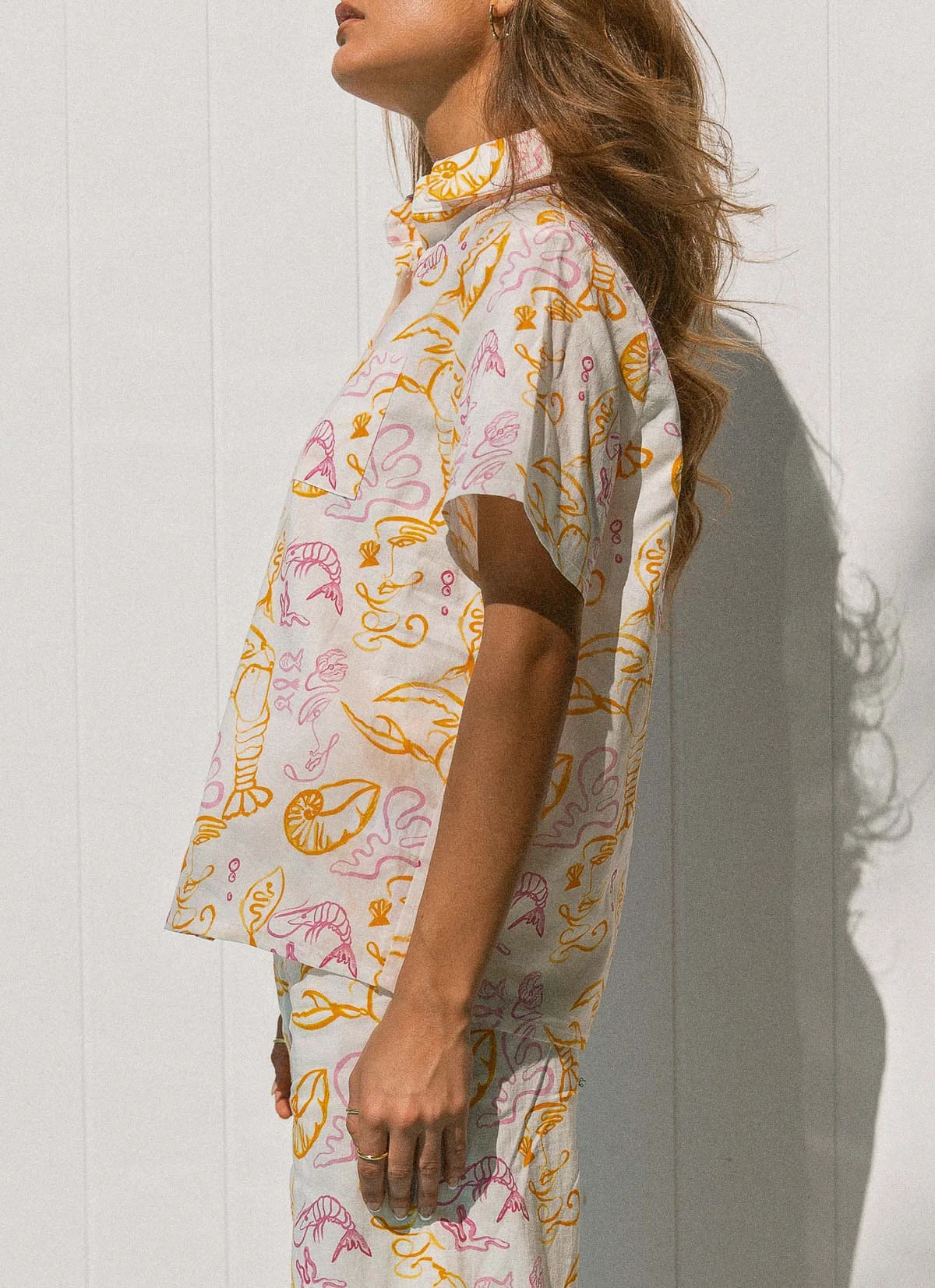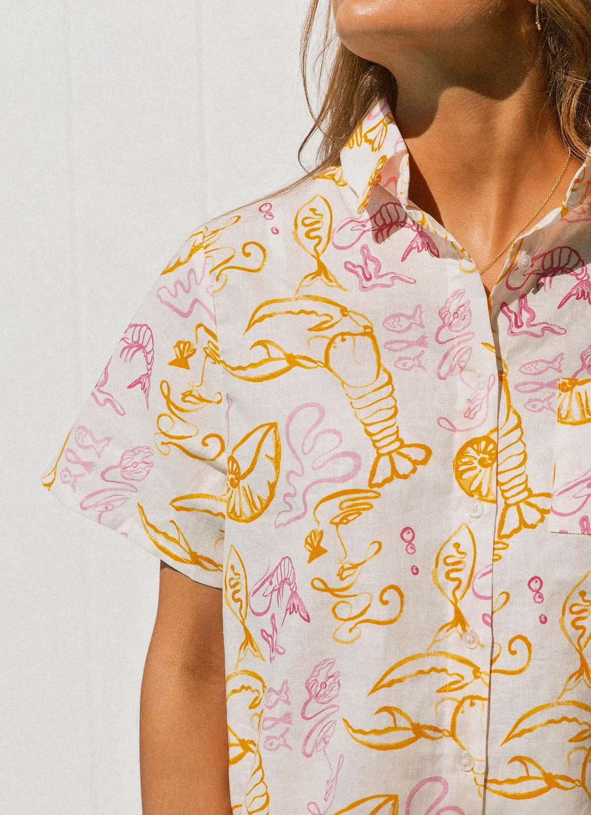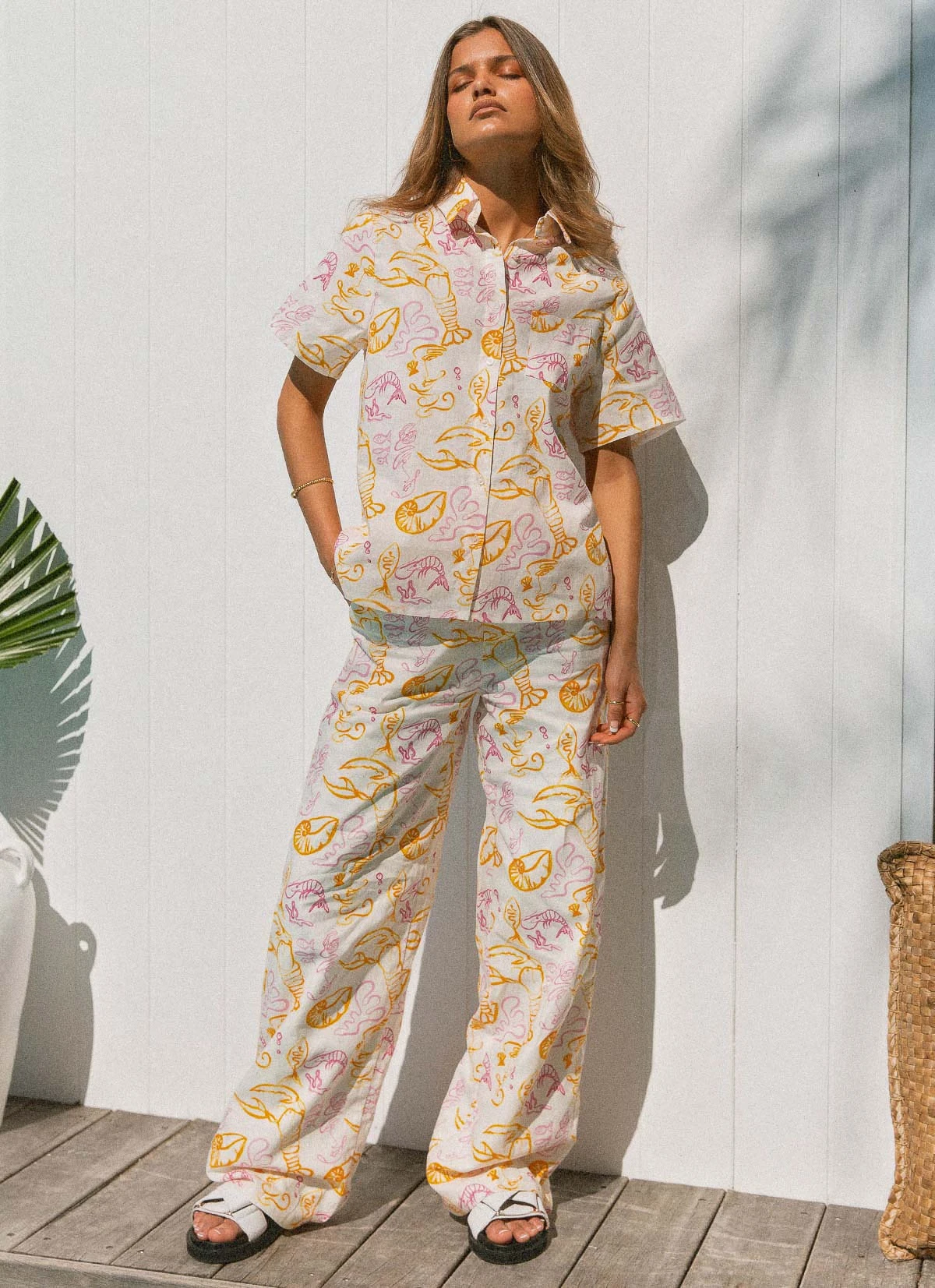 Poolside chic in the Entree Short Sleeve Shirt. Crafted from crisp, light linen and featuring our exclusive Peppermayo x Rikki Day print, this collared, button down shirt is the perfect cover up over swimwear or complete the summer set with the Sicilian Linen Pants.