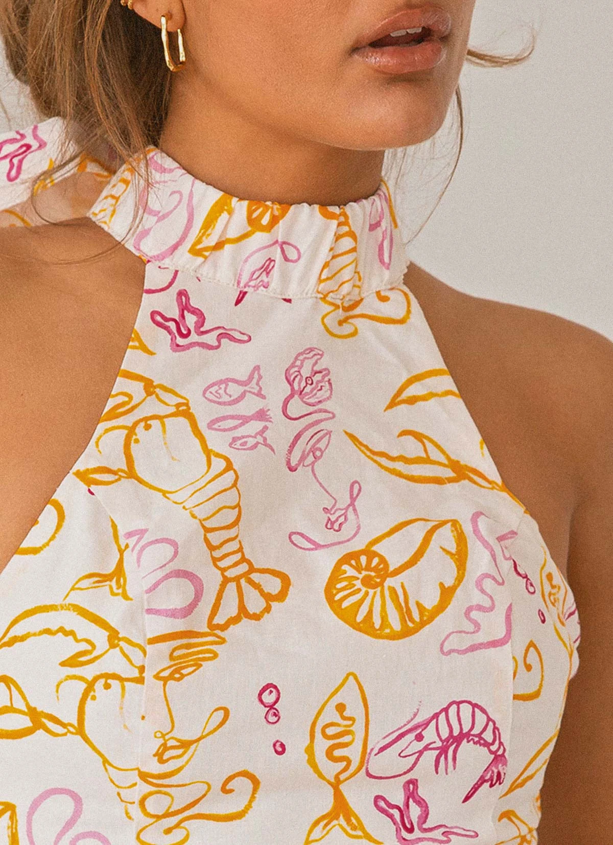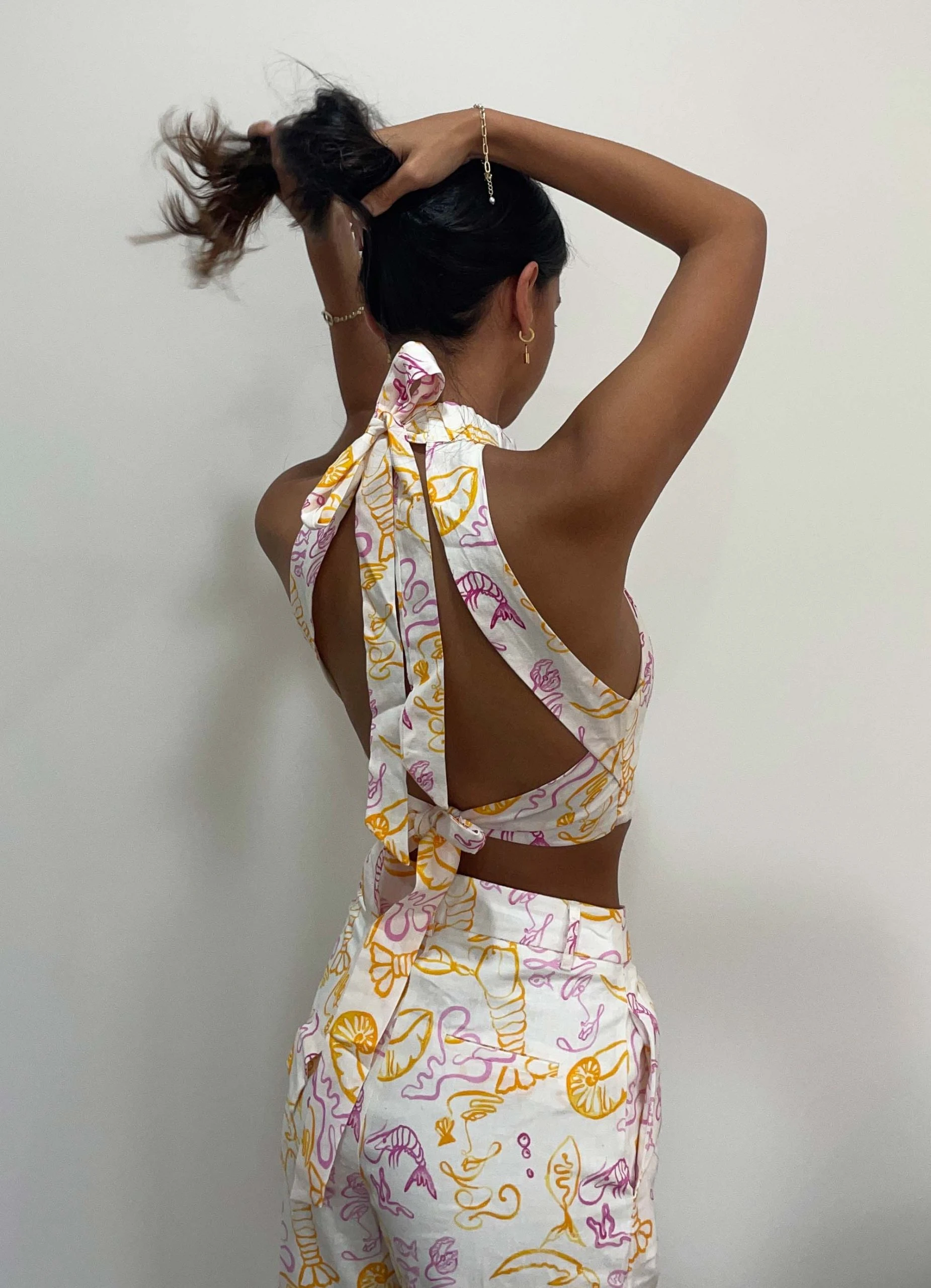 Date night ready with the Fresco Linen Halter Top. Crafted in crisp, light linen and featuring our exclusive Peppermayo x Rikki Day print with thick strap halterneck and open back detailing the crop top is sure to become your summer favourite. Simply styled with the Sicilian Linen Pants, strappy mules and chunky gold jewellery.