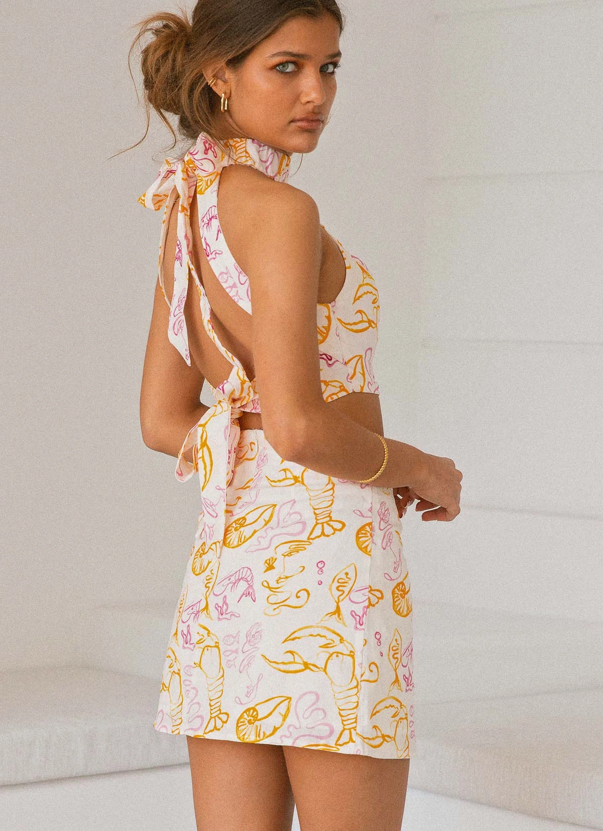 Aperol in hand and living your best life, you must be wearing the La Dolce Vita Linen Mini Skirt! Crafted from light linen and made for sunset cocktails, this cute ‘lil mini skirt is designed to be worn higher on the hips and features our exclusive Peppermayo x Rikki Day print.