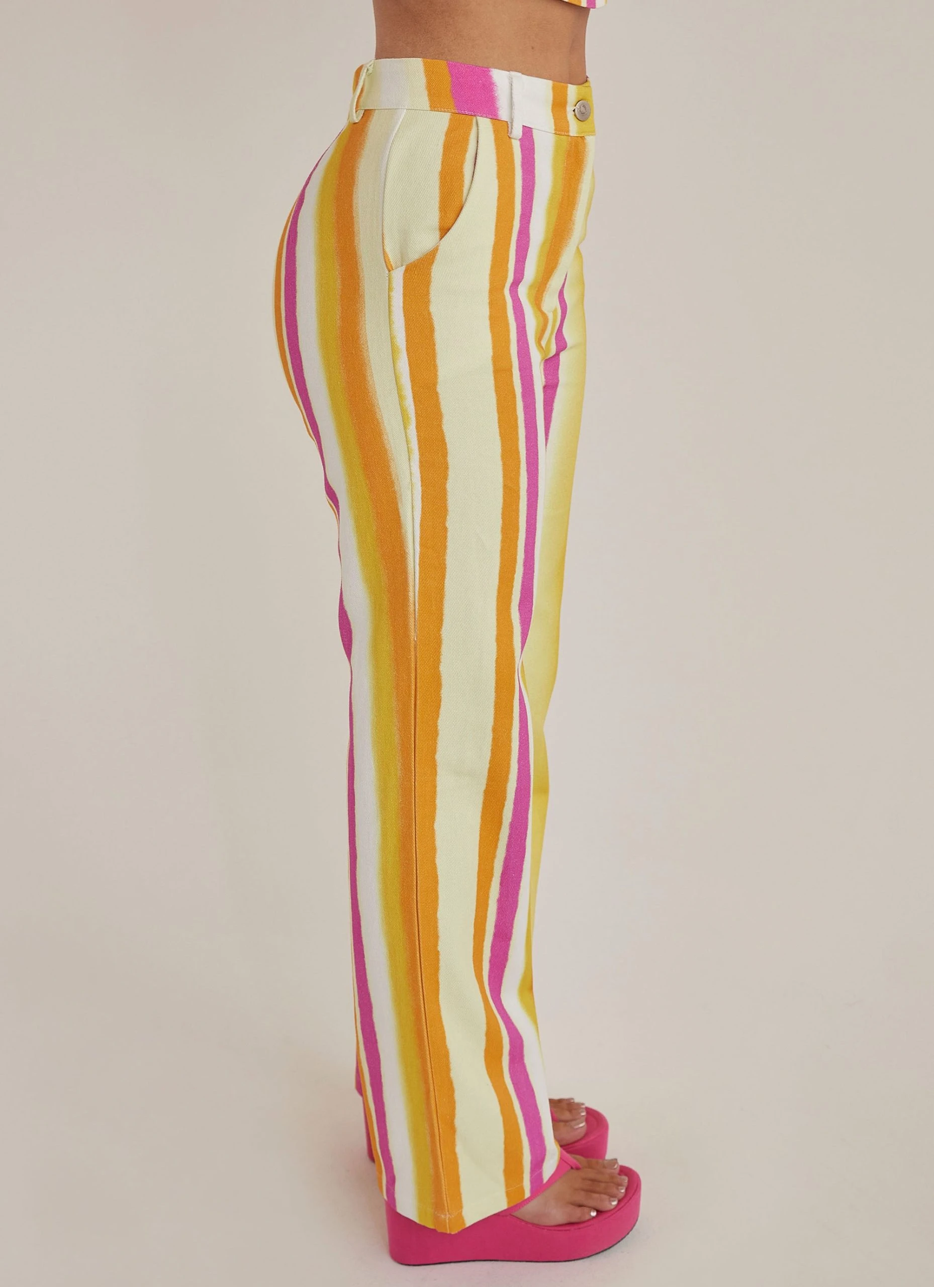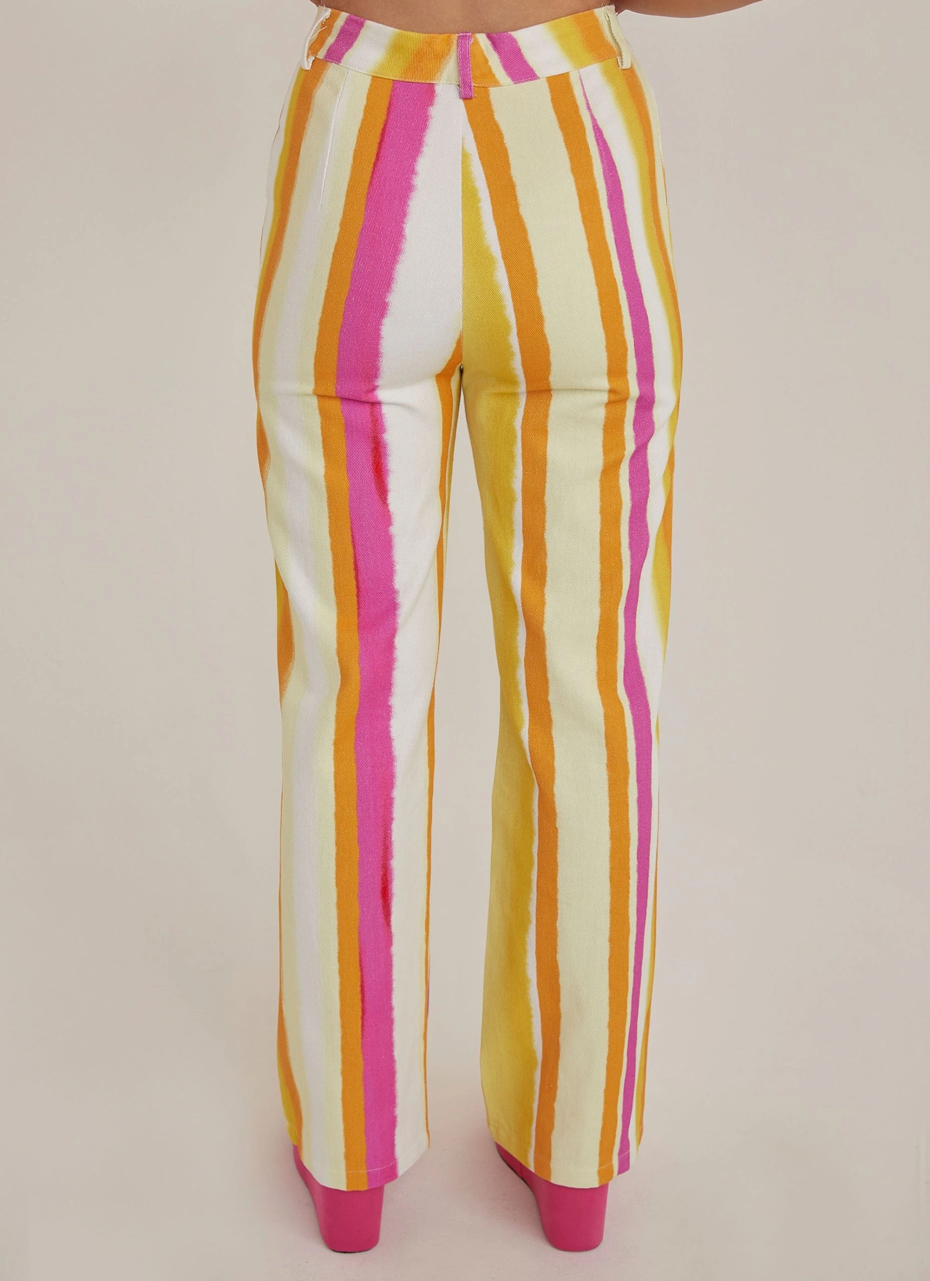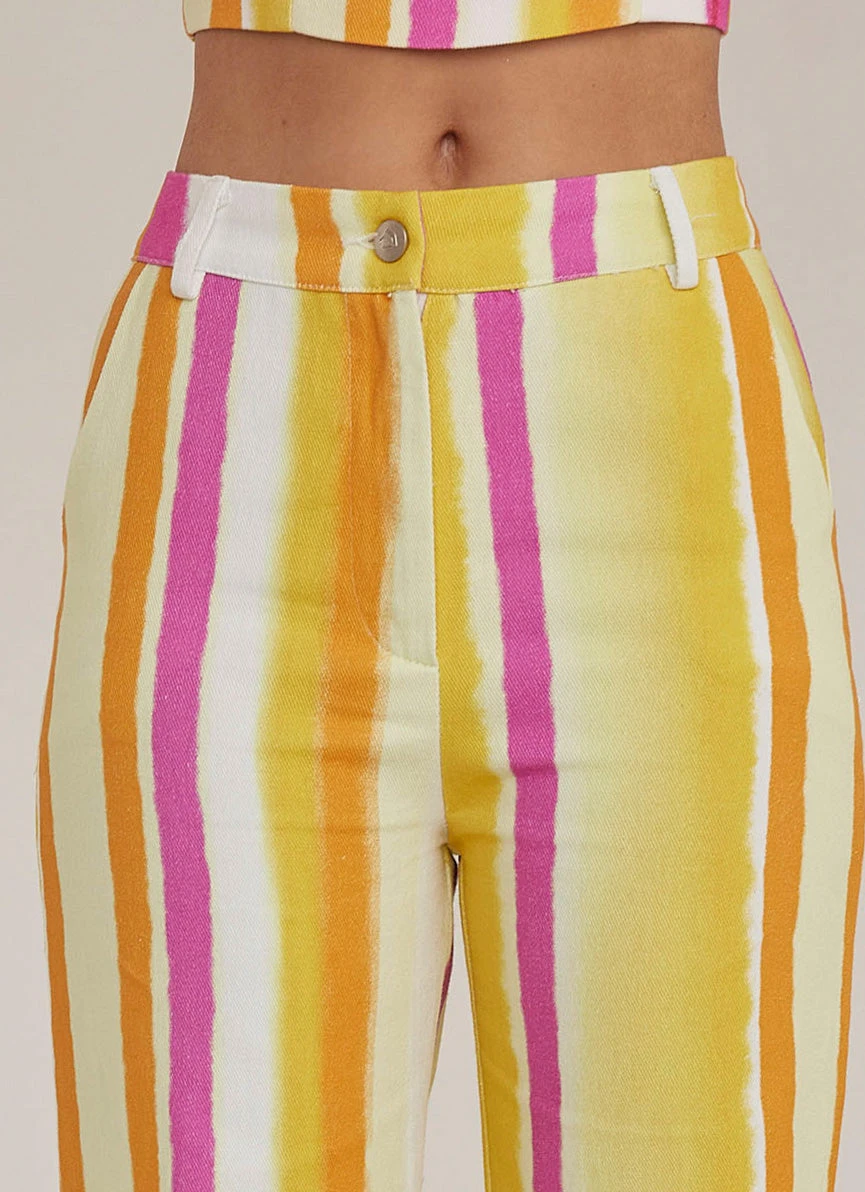 Obsessed is an understatement! The Estate Pants are a high waisted straight leg jean in our gorgeous Sunset Stripe print made of pink, orange and yellow hues. We love them paired back with a cropped tank and chunky gold jewellery.
