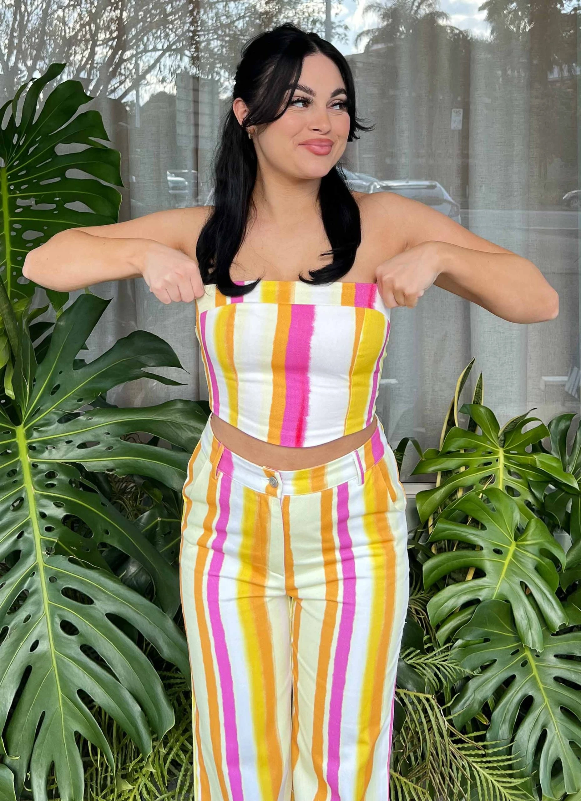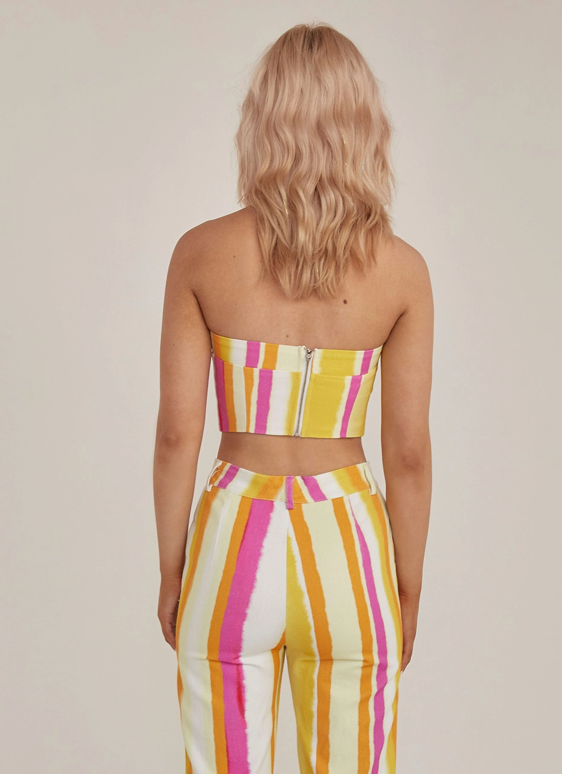 Always fresh in the Refreshment Bustier Top. A denim bustier in pink, orange and yellow hues. The ultimate summer palette and the ultimate summer look paired with the Estate Pants and layered with the Sunkissed Dreams Shirt.