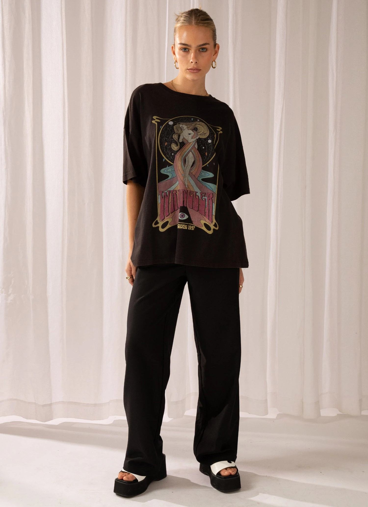 This super oversized fit tee is our biggest yet. This 90s skater inspired fit can be worn layered over long sleeve tees and skivvys, or even with nothing underneath as a dress. Featuring Wrangler original artwork print has been specially faded to appear already worn in for years.
